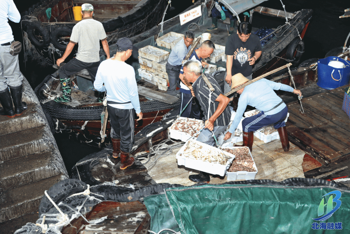 8月17日凌晨4时许,北海银海区侨港镇鱿鱼码头灯火通明、人声鼎沸、马达轰鸣。随着一艘艘小艇靠岸,一筐筐生猛海鲜被工人挑上岸,顿时吸引大批头戴头灯的商贩围上前看货询价。